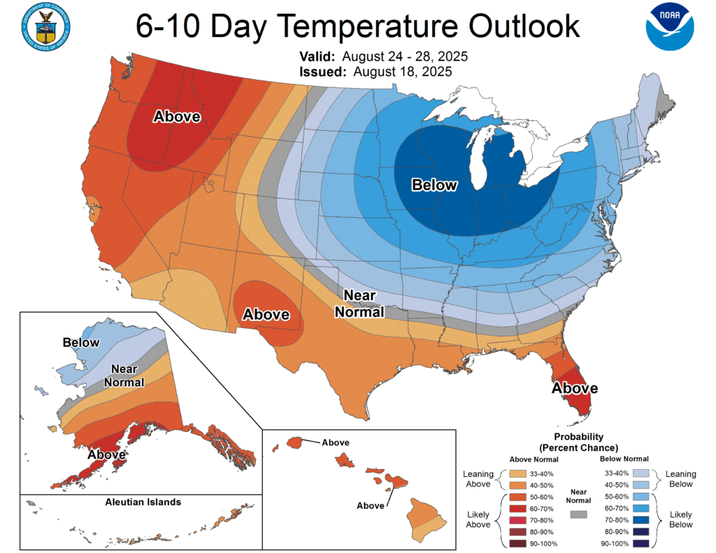 Something we haven’t seen in a long time from NOAA’s temperature outlooks: a likelihood of temperatures being below normal! At least for the 6-10 day outlook. The likelihood is much weaker in the 8-16 day outlook.