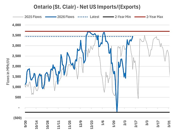 Ontario’s imports to the US through St. Clair (Dawn) have nearly returned to the 2-Year Max highs set back December and early January, possibly being the push that Union Gas needed to comfortably lift all restrictions on gas flows yesterday (such as storage withdrawals, Parkway flows, TCPL flows, Nexus flows, etc.). Dawn spot pricing remains soft going into the weekend.
