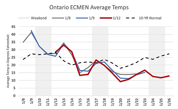 A rally to begin the week, seems like NYMEX is correcting itself after Friday’s big sell-off, even in the face of meteorologists predicting an impending cold snap. February 2026 settled up 24 cents to $3.41 US/mm. Forecasts have not shifted too far since Friday. After some recent warmth, Ontario temperatures should plunge to below normal this week, and especially next week. Demand is up in the Northeastern US as they experience cold as well, Canadian gas exports to the region are quite high, and thus so are Dawn storage withdrawals. While NYMEX gets its footing amid these changing conditions and any geopolitical news, Dawn spot prices will likely soon reflect the incoming heating demand.