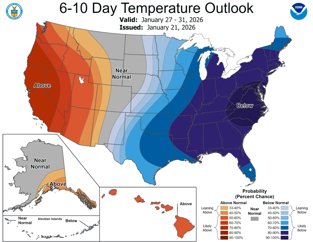 NOAA’s temperature forecasts are holding steady for the late January period, and starting to warm up some going into early February. Interestingly, the ECM Ensemble model forecasted that within the 11-15 day period, Canadian temperatures are also warming up by 10.9 degrees Fahrenheit. In the coming days we will compare when various models are predicting the cold spell to end. Remember though, that temperature models are having considerable difficulty forecasting cold in the 16-30 day period, so it may not be clear until a few days from now.