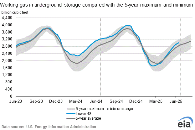Happy storage day! The EIA reported an injection of +53 Bcf, which is exactly the 5-year average for this time of year. Safe to say the breakneck pace of early injection season is done for now. As of July 10, there is 3,006 Bcf of gas in the lower 48’s storage, which is up 6.1% from the 5-year average of 2,833 Bcf, but down from last year’s historic season by a margin of 5.8%. Storage remains says ahead of average, but not by a gap comparable to last year.
