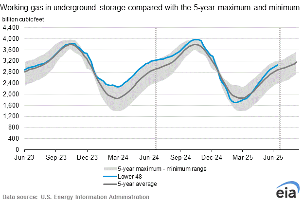 Today is storage day, so the EIA reported an injection of +46 Bcf. As of July 17, there is 3,052 Bcf of gas in the lower 48’s storage, which is up 6.2% from the 5-year average of 2,874 Bcf, but down from last year’s historic season by a margin of 4.9%. Storage remains ahead of the 5-year average, but not by a gap as historic as last year’s, and total working gas is well within the five-year historical range.