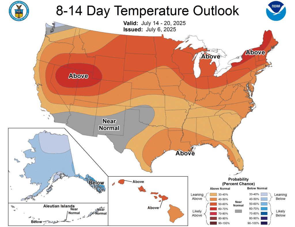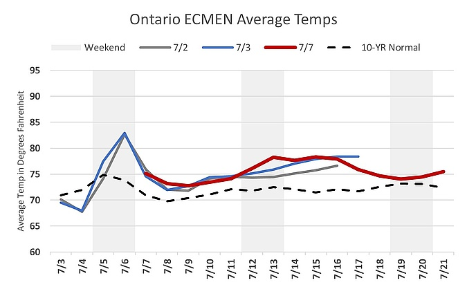 We feel the heat! Temperatures in Toronto feel as high as 32 degrees Celsius today, just as we come finish up a weekend spike above normal temperatures according to the ECMEN weather model. Currently, temperatures are expected to remain above the 10-year normal through until the 20th, and NOAA’s model agrees.