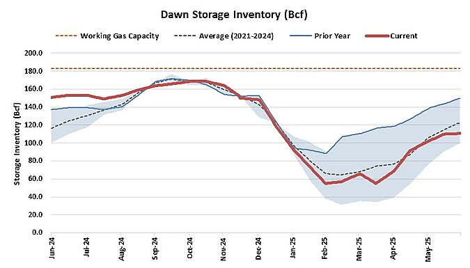 On the storage front, Enbridge reported that as of July 1st, Dawn has 113 PJs of working storage in its inventory (its working gas capacity being 186.8 PJs), meaning that it is over 60% full with three months left to go of injection season. Since this winter, Dawn inventories have stayed at or below the 10-year average. Unsurprisingly, they are well below the prior year.