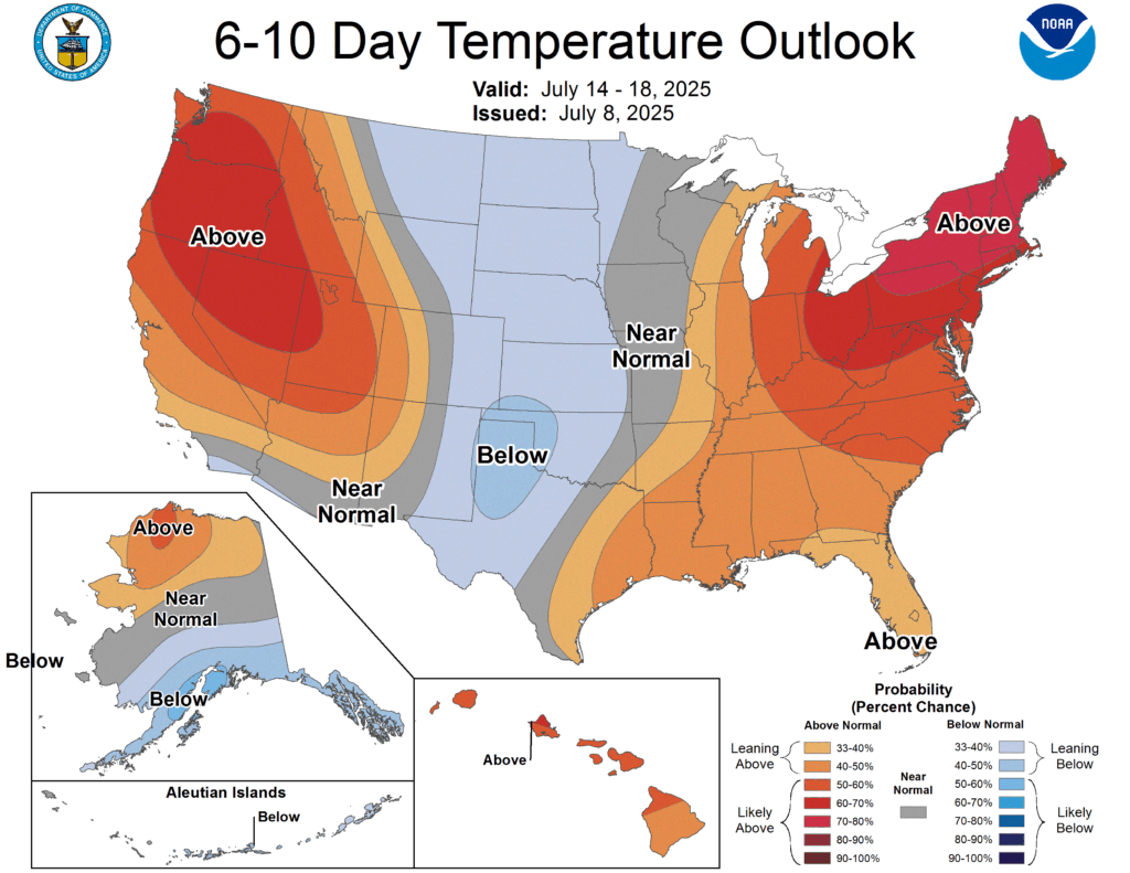NYMEX futures continued to fall today, down another 12 cents in the August front month, which settled at $3.21 US/mm. Meanwhile, some heat is expected in the North Eastern US over next week.