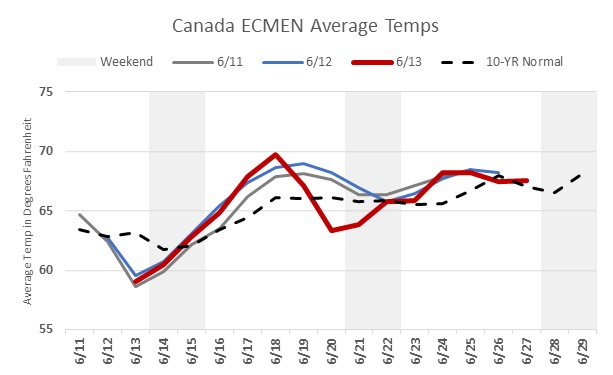 Going into the weekend, Canadian temperatures are currently below normal, but set to increase to reach a peak mid-next week, then fluctuating around normal. NOAA’s temperature outlook for the next week or so is also looking warm all over, especially in the East.