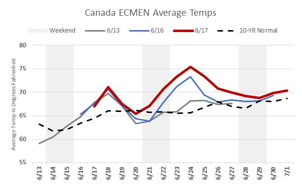 More locally though, daily temperatures keep creeping up. Canada’s average temperatures are expected to be above normal, especially next week. Canadian production is still lower than normal, staying flat at just under 17,500 MMcf/d. Wildfires continue to burn in British Columbia, but the number of out of control fires has been decreasing.