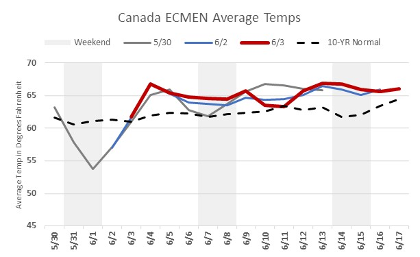 A pretty quiet, warm Tuesday in Toronto. Canadian temperatures have warmed back up and are set to stay just above normal for the next couple weeks. NYMEX gas futures remained flat, only rising by a couple pennies by the day’s close.