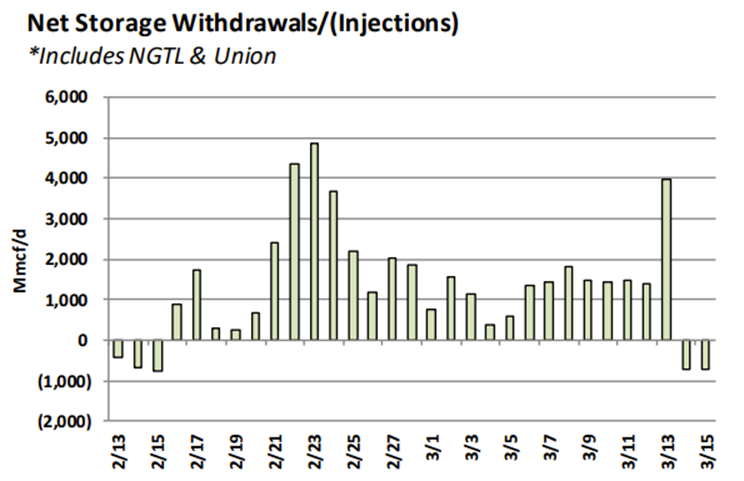 A rather uneventful day for the market with no change to NYMEX 12-monthh futures contracts, Dawn moving up $0.01 CAD/GJ, and WTI down $1.26 USD/b to $91.09 USD/b. April is shaping up to be a serious constraint month for Appalachian supply into Dawn. NEXUS, Rover, and REX all face maintenance, and the timing stacks on top of itself. Flows toward Vector St. Clair and Dawn could stay under pressure for most of the month, with only short windows where the system is relatively clear. (JM)