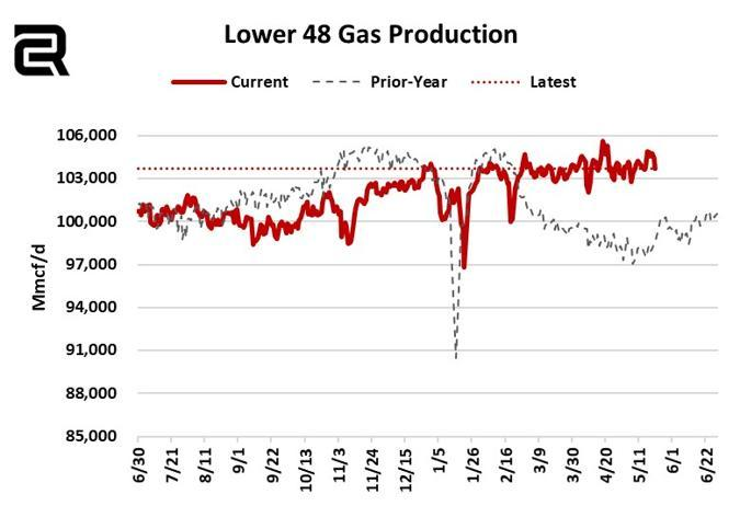 Production in the lower 48 states continues to fluctuate slightly day to day, but overall remains quite strong in the face of increasing demand for LNG and electricity. Current production levels are about 103.7 Bcf/d according to Criterion, and Constellation reporting the year-to-date so far to be 104.2 Bcf/d. Compare this to the 101.6 Bcf/d output at this time last year, and its easy to see that the market has a relatively comfortable amount of supply, though more is needed to meet future demand.